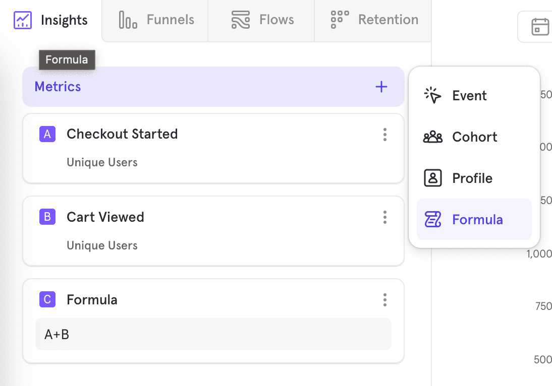 Metrics are basing building blocks of an Insights report. A metric is made up of a behavior, and a way to measure that behavior. By default, Insights will prompt you to select the most basic form of a behavior: an event. However, you can also press the ”+ Metrics” button to select add a metric based on a different type of behavior. You can also add a formula, which is a metric that is a function of other metrics.